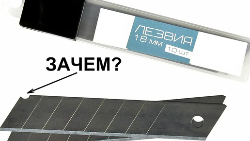 Наверняка каждому приходилось сталкиваться с канцелярскими и строительными ножами, к которым нужны сменные лезвия. Различие между строительным ножом и канцелярским довольно условные, но при этом лезвия для них продаются одинаковые. Различаются они размером, а вот что действительно их объединяет, так это довольно странная выемка. Существует множество довольно причудливых объяснений реального предназначения этой выемки. Так некоторые утверждают, что она сигнализирует потребителю о том, что лезвие не было отломано по риске, и что им никто не пользовался...