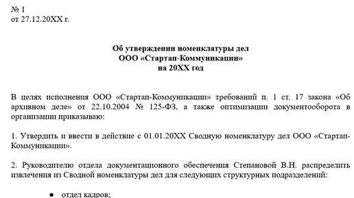 Приказ об утверждении номенклатуры дел - образец (2024)