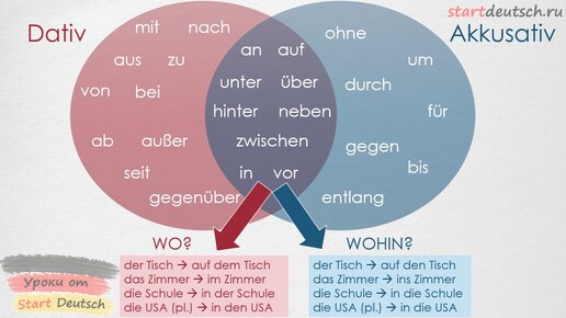 Те, кто занимается со мной немецким языком знают, что вышеприведенная картинка является моей самой любимой, поскольку она очень наглядно изображает тему правил использования предлогов в немецком языке. Если на нее внимательно посмотреть и проанализировать, то станет понятным как используются немецкие предлоги. А именно: почти все немецкие предлоги требуют употребления после себя дополнения ( существительного или местоимения) в строго определенном падеже: дательном (предлоги в розовом круге), винительном...