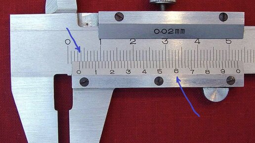 Сколько показывает этот штангенциркуль? Всё, что мы можем сказать по положению отметки (ноль нижней шкалы) – это что измеряемая величина примерно между 3 и 4 мм. На глаз определить сложно. Как узнать точнее? Для этого у штангенциркуля есть нижняя шкала, так называемый верньер или нониус. Чтобы повысить точность измерения, пробежимся по нижней шкале и найдём первое деление, которое совпадёт с каким-нибудь делением основной шкалы. Похоже, что в нашем случае это деление с отметкой 6 на нижней шкале...