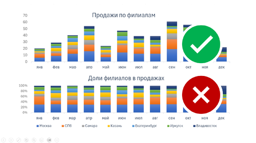 Почему директор сделает не верные выводы? Проблема в нормировании данных. По моему опыту, нормированная диаграмма опасна для бизнеса и приводит к ошибочным выводам. Однако есть способ ее правильного использования. Рассмотрим на примере данных ежемесячных продаж в разрезе филиалов. Обычная диаграмма и нормированная. Верхняя диаграмма показывает общую динамику продаж по всем филиалам и вклад каждого из них. Здесь видны точки роста и падения каждого филиала, а также общие сезонные колебания. Нижняя, выделит долю каждого филиала в общем результате в процентном выражении...