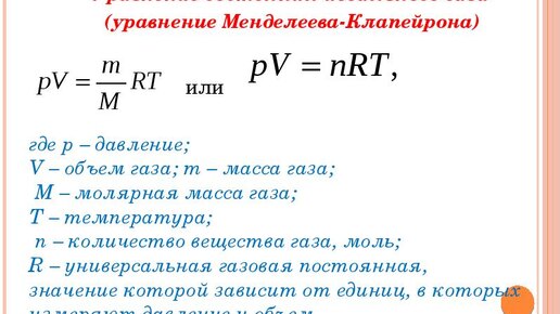Термодинамические характеристики идеального газа описываются одним простым уравнением. Математическая запись универсального газового закона проста: pV = nRT * Она содержит основные характеристики поведения газов: p, V и T — соответственно давление, объем и абсолютная температура газа (в градусах Кельвина), R — универсальная газовая постоянная, общая для всех газов, а n — число, пропорциональное числу молекул или атомов газа (так называемое число молей газа — см. Закон Авогадро). Чтобы понять, как работает этот закон, давайте представим, что температура газа постоянна...