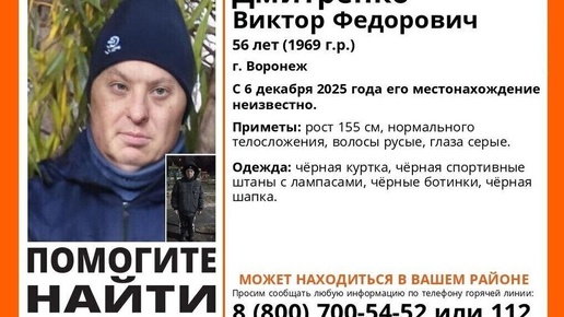 В Воронеже разыскивают пропавшего без вести 56-летнего Виктора Дмитренко. Мужчина, сероглазый, русые волосы, рост 165 см, нормального телосложения, вышел из дома в неизвестном направлении в субботу, 6 декабря. В день исчезновения он был одет в черную куртку, черные спортивные штаны с лампасами, черные ботинки и черную шапку. Ориентировку опубликовал региональный поисково-спасательный отряд «ЛизаАлерт» в Telegram. Добровольцы...