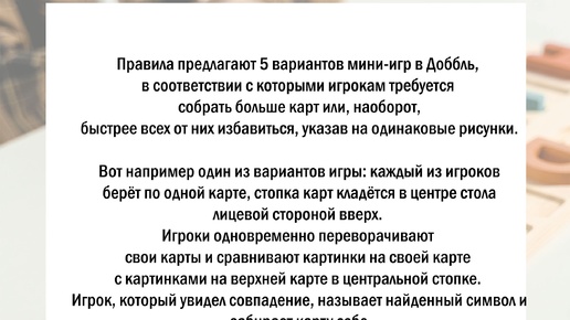 Особенность этой игры в том, что на каждой паре карт вы всегда найдёте одну и только одну общую картинку. Игра развивает зрительное восприятие, внимательность и реакцию. Существует несколько вариантов мини-игр в Доббль...