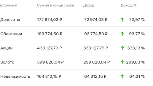 Нашел интересный калькулятор доходности, где наглядным образом можно оценить доходность того или иного финансового инструмента за определенный (прошедший) промежуток времени. Возьмем для примера промежуток времени в последние 10 лет - с сентября 2013 года по сентябрь 2023 года. Допустим, в сентябре 2013 года мы вложили по 100 000 рублей в каждый из инструментов (депозиты, облигации, акции, золото, недвижимость). И вот какая доходность у нас выходит за эти десять лет: Если рассматривать доходность...