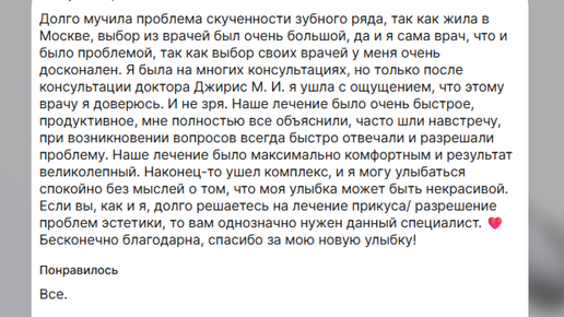 Ортодонтическое лечение — это долгий путь, который врач проходит вместе с пациентом. Месяцы, а иногда и годы совместной работы, преодоления трудностей, корректировки планов. И когда в конце этого пути пациент пишет искренние слова благодарности — это лучшая награда для любого доктора. Каждый отзыв — это история преображения. За сухими словами «исправил прикус» стоит человек, который перестал стесняться улыбаться, обрёл уверенность в себе, изменил жизнь. Осознание того, что ты стал частью этой трансформации, даёт силы и вдохновение продолжать работу...