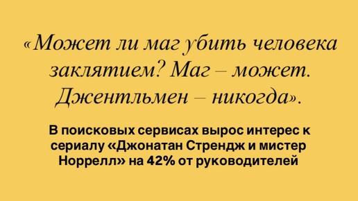 «Джонатан Стрендж и мистер Норрелл» в 2025-м: почему руководители изучают магию XIX века, чтобы вытащить себя из ментального тупика Как сцена с Королём Вороном объясняет состояние российских предпринимателей с выручкой от 300 млн до 20 млрд в год Осенью 2025 года в поисковых сервисах вырос интерес к сериалу «Джонатан Стрендж и мистер Норрелл» на 42%. В возрастной группе 36–59 лет, среди владельцев компаний и топ-менеджеров, чаще всего включают три сцены: разговор Стренджа с Норреллом о том, что...