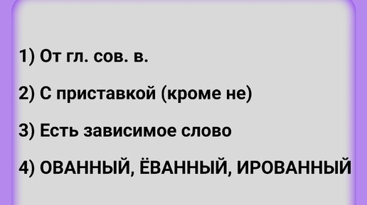 Причастия и отглагольные прилагательные В полных причастиях пишем -НН, а в отглагольных прилагательных – -Н Как отличить причастие от отглагольного прилагательного? Для этого надо знать 4 признака: 1) Если слово образовано от глагола совершенного вида, то перед нами причастие. А причастие в полной форме пишется с двумя буквами -НН Оставленные – от гл. оставить (что сделать? Сов.в.) Заброшенный – от гл. забросить (что сделать? сов.в.) Если слово образовано от глагола несовершенного вида, то перед нами отглагольное прилагательное...
