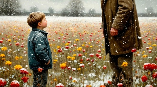 Он ещё маленький. Лет пять-шесть. Над головой небо голубое-голубое, облаков нет и солнце не только светит, но и греет. Над головой небо, а перед ним поле. Трава местами высокая, луга в цветах и всё перед ним. За полем, за высокой травой и цветами, лес, но он так далеко, что и думать о нём не стоит. Так далеко этот лес, что ему до него ни в жизнь не добраться. Подумал он так, как вдруг стоит уже старше прежнего, в центре поля цветочного. Голову поднял. - Ну хоть небо на месте и солнце, светит и греет...