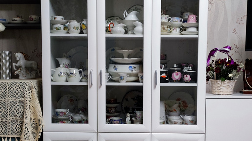 Приветствую всех на своём канале! С понедельника я занимаюсь перестановкой и расстановкой своих фарфоровых сокровищ. Хочется всё расставить так, чтобы были хорошо видны все предметы на полочках. Не знаю как вам, но мне пока нравится, правда переставляла раза три, пока сложила свои "пазлы")) Сегодня покажу первый шкаф, который трёхстворчатый, второй у меня ещё в процессе. В него я поставила три сервиза, несколько небольших наборов и чайные пары. Начну слева, на верхней полке разместила сервиз Золотой дождь, под ним два небольших комплекта - Берёзовые бруньки и Жёлтый тюльпан...