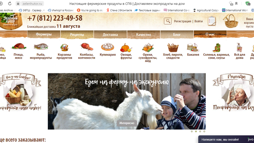 В Санкт-Петербурге есть прекрасный сервис доставки фермерских продуктов "Зелёный хутор". Доставляют и по городу, и по Ленинградской области. Работают с 2010 г. и имеют полную линейку продуктов, в том числе корм для кошек и собак и бытовую нехимию. Доставка от 5000 рублей безоплатная, и есть самовывоз с Обводного канала. Пока были два дня в неделю доставки, а сейчас планируют вводить и ежедневную доставку. Сначала были в основном только фермеры, а впоследствии стали включать и больше сертифицированных органических производителей...