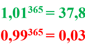 Вся наша жизнь состоит из математики. Сейчас мы имеем в виду не цифры на ценниках в магазине, а успехи в жизни. Взгляните на два равенства: Что Вы видите в них? Если человек на протяжении длительного времени делает хотя бы на 1% больше, чем от него требуется, он увеличивает свой результат в 37 раз! В то же время, если человек хотя бы на 1% не доделывает и работает принципу «И так сойдет!», то значительно проседает в результатах. Вы не доделываете работу на чуть-чуть и уже не имеете того, чего достойны...