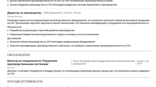 Изучение примера резюме заместителя генерального директора по производству — лучший способ понять, как составить документ, который действительно работает. 💡 Анализ готовых решений поможет понять структуру и содержание, которые выделят вас среди других кандидатов и приблизят к цели — получению работы. В нашей статье вы найдете всё необходимое, чтобы создать эффективное резюме заместителя генерального директора по производству: Изучив пример, вы сможете создать резюме с помощью нашего конструктора резюме...
