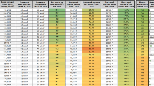 Второй год замеряю доступность недвижимости в городах РФ по собственной методологии. Что она учитывает: ▪️ Медианный доход по регионам. В моем случае это функция от среднего дохода (65% от среднего). В расчете смоделирована ситуация, в которой молодая семья получает 2 медианных дохода по своему региону. ▪️ Доступность вторички. Наша модельная молодая семья откладывает часть дохода на первоначальный взнос, а потом берет вторичку в ипотеку по рыночной ставке на 15 лет (30% взнос). Рыночная ставка взята...