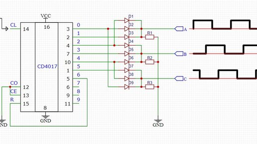 Доброго времен суток, друзья)) подумал я что стоит написать некое дополнение к предыдущий статье, хоть там и практически полностью раскрыта тема данной микрухи, но на самом деле, мало кто даже задумывался о том какой потенциал у CD4017. или я ошибаюсь? Чаще всего видят её как обычную мигалку для светодиодов, или гирлянды.в этой статье я стараюсь показать что CD4017 способна на нечто большее, например как в схеме выше на её основе построен трёхфазный генератор который можно использовать для бибколлекторах двигателей...