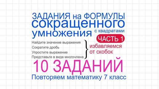 Задания на формулы сокращенного умножения с квадратами Часть 1 Упростите выражение. Повторяем математику 7 класс