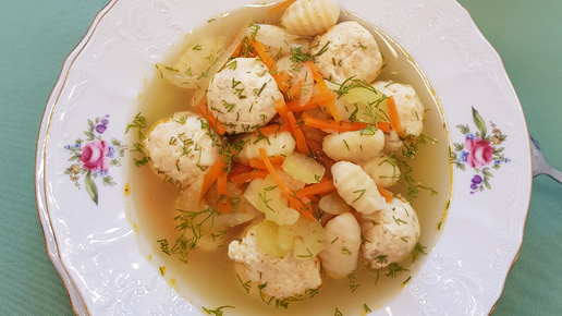 Добрый день, дорогие друзья! Сегодня я представляю вашему вниманию лёгкий суп с насыщенным вкусом, состоящим из небольшого количества ингредиентов, который оценят ваши родные и близкие, особенно дети. Для приготовления 12 порций нам понадобятся: 1 килограмм филе куриной грудки, 500 грамм готовых картофельных клёцок ньокки, 20 грамм сухариков из белого хлеба, 60 грамм молока, 200 грамм моркови, 300 грамм репчатого лука, 150 грамм стебля сельдерея, 2 чайные ложки соли, 2 чайные ложки приправы для курицы, 2 столовые ложки подсолнечного масла, 10 грамм зелени укропа...