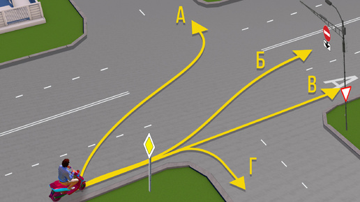 По какой траектории разрешено движение? 1. Только по траектории Г. 2. По траекториям В и Г. 3. По траекториям А, В и Г. 4. Все траектории разрешены. Правильный вариант ответа в конце статьи. Ссылка на ПДД. 18.2. На дорогах с полосой для маршрутных транспортных средств, обозначенных знаками 5.11.1, 5.13.1, 5.13.2 и 5.14, запрещаются движение и остановка других транспортных средств на этой полосе, за исключением: школьных автобусов; транспортных средств, используемых в качестве легкового такси; На...
