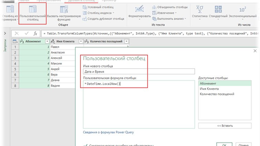 В данном примере будет показано, как отображать дату и время изменений файла не тратя время на внесение этих данных. Имеем таблицу посещений клиентов; Для загрузки в Power Query, я отформатировал диапазон как таблицу и задал ей имя Таблица_тренировок. Переходим на вкладку «Данные» и загружаем таблицу в Power Query. Для того, чтобы добавить текущую дату и время в столбец, переходим на вкладку «Добавить столбец», выбираем «Пользовательский столбец», и в окне формул пишем задаём название столбца и пишем формулу DateTime...