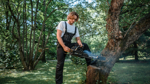 Для дачи нам нужна была цепная пила, как дров попилить, так и для строительства. Почитав интернет, муж так и не понял, что лучше покупать, бензиновый или электрический инструмент. Нормальных обзоров так и не нашел именно в сравнении, везде было сказано только, что электрическая пила слабее. Поэтому первая пила у нас оказалась бензиновая - Huter BS-52 - мощность 2800 Вт, 3,81 лошадиных силы, 52 куб.см, длина шины 50 см, вес 7,5 кг. По словам мужа, мощности много не бывает, и что хороший инструмент должен быть крепким и тяжелым...