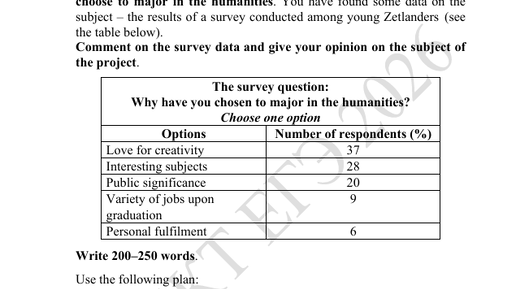 Часть 1: Введение (Opening statement) Первый абзац эссе. Ты говоришь, что работаешь над проектом, указываешь тему, источник данных и цель эссе. Чтобы показать, о чём эссе и что ты будешь делать. 2-3 предложения, 30 слов. Как делать? Следуй шаблону: "I am currently working on a project on [topic]. I have found a table showing the results of a survey on this topic. In this essay, I will analyse the data and provide my opinion." Упражнение 1.1: Заполни пробелы (Fill in the blanks) Ты вставляешь слова в шаблон...
