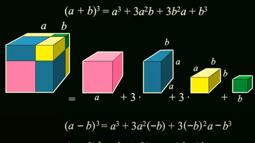 Часть обучающихся лучше понимают через образы. Квадратные уравнения реально про квадраты. Куб суммы, внезапно == сумма площадей кубиков. Разность кубов == разность площадей кубов Стала легендой Куба,...