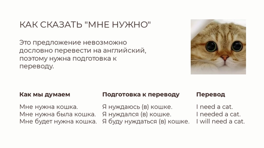 С этой простой фразой совершается очень много ошибок. Вот они👇 ❌Во-первых, изучающие могут перевести слово "мне" дословно и получается "me", а оно не может быть подлежащим. И выходит "Me need". ❌Во-вторых, в прошедшем времени есть слово "было" ("Мне было нужно") и они его тоже переводят. Получается "Me was need". ❌В-третьих, мы по-русски можем сказать "Я нуждаюсь в кошке", и здесь применяется предлог "в". В итоге у нас "Me was need in a cat" - это, пожалуй, наихудшая версия. Остается только забыть артикль "a"😂 Правильная стратегия ✅Шаг 1...