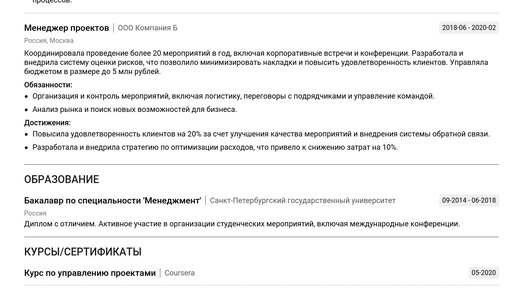 Пример резюме account manager event перед вами – это готовая основа, чтобы быстро составить свое эффективное резюме. Изучение таких примеров значительно повышает ваши шансы получить желаемую работу. В этой статье вы найдете все, чтобы составить идеальное резюме. Мы подготовили . Изучив пример, вы сможете создать резюме с помощью нашего конструктора резюме. Заголовок резюме должен четко отражать вашу специализацию и уровень профессионализма. Для профессии "account manager event" важно указать, что вы занимаетесь управлением клиентскими отношениями и организацией мероприятий...