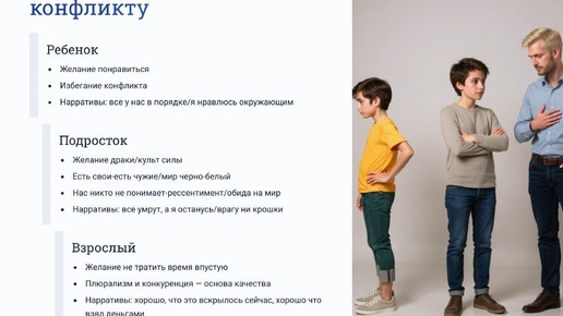 Эволюция отношения к конфликту: от избегания до осознанности Когда-то я думала, что конфликты - это про силу. Потом - про принципы. А теперь понимаю, что чаще всего - про потраченное время.🙈 Итак, на днях я увидела интересный материал про эволюцию отношения конфликту с которым хочу вас познакомить: 👶Ребенок: "Главное - чтобы меня любили" Стратегия: избегание конфликта любой ценой. Нарративы: 📌"Все в порядке, я нравлюсь окружающим" (даже если это не так) 📌"Лучше промолчу, чем буду спорить" 📌Если я буду удобным, меня не бросят" Ребенок часто верит: конфликт = угроза отношениям...