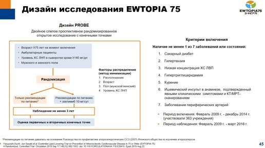 Эзетимиб обычно занимает скромное место в тени статинов. И как самостоятельный лекарственный препарат почти не рассматривается. Действительно, сила его влияния на холестерин ЛПНП ("плохой") в 2 раза уступает силе статинов. Т.е. на фоне применения эзетимиба можно достичь снижения ХС ЛПНП на 20-25% от исходного. Как это влияет на прогноз, риск инфарктов/инсультов - оставалось неизвестным. Пока не появились данные очень интересного исследования EWTOPIA 75. В чем его смысл? Известно, что позиции статинов в первичной профилактике (т...