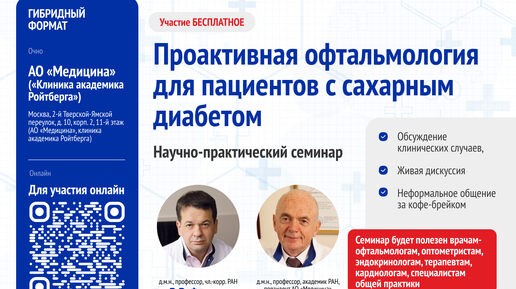 📅 Когда: 28 ноября 2025 года ⏰ Время: 14:30-17:20 (МСК) 💻 Формат: очно/онлайн Место проведения: г. Москва, 2-й Тверской-Ямской пер., д. 10, АО «Медицина» (клиника академика Ройтберга), корпус 2, конференц-зал, 11-й этаж. «Зрение в фокусе эндокринолога: как системный контроль диабета предотвращает сосудистые катастрофы в глазу» Фадеев Валентин Викторович — д.м.н., профессор, чл.-корр. РАН, директор клиники эндокринологии Первого МГМУ им. И.М. Сеченова. «Диагностика диабетической ретинопатии: технологии и протоколы» Бехорашвили Ираклий Юзаевич — врач-офтальмолог АО «Медицина»...