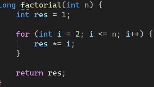 Что такое факториал? Факториал - это произведение всех натуральных числе от 1 до числа факториала. Например, факториал пяти - 5! = 1 * 2 * 3 * 4 * 5 = 120 1. Объявляем функцию, которая возвращает long и принимает параметр n в виде целого числа int или long. 2. Объявляем переменную res и присваиваем ей значение 1...