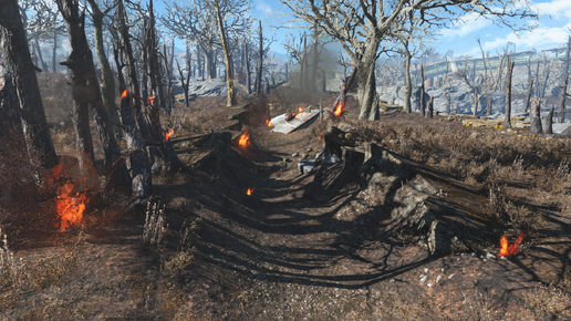 При достижении главным героем 20 уровня стоит обращать внимание на небо Содружества. В этой статье я расскажу вам о маленькой интересной детали, связанной с пришельцами в Fallout 4. Поехали! После выше указанного уровня, в небе можно увидеть странный летящий вниз голубой диск. Очевидно, что это падающий инопланетный корабль. Место падения корабля находится недалеко от локации Станция "Оберленд". Если идти на восток от станции, то можно заметить горящий лес и сам корабль, который почти на половину врыт в землю...