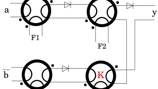 Оперативная память на ферритовых сердечниках далеко не единственный пример использования магнитных элементов в цифровых вычислительных машинах. Существовали и экзотические, с сегодняшней точки зрения, импульсные феррит-диодные и феррит-транзисторные логические ячейки, в 50-е - 60-е годы прошлого века. Сегодня этот тип логики основательно забыт, по вполне естественным и обоснованным причинам. Однако, мне кажется интересным вспомнить, хотя бы с исторической точки зрения, как такая логика работала. Да, это все устарело...