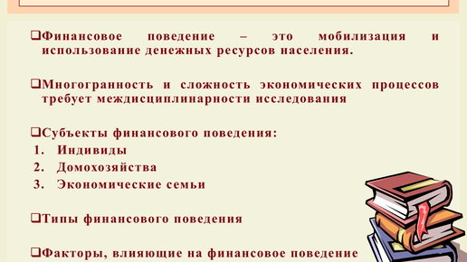 Рано я начал "копать вглубь", когда основные понятия еще не пройдены. Хотя все мы на интуитивном уровне понимаем, что такое финансовое поведение. Здесь же поговорим о нем немного детальнее, подробнее, чуть-чуть зануднее (в большей степени с позиции экономической социологии), вдруг пригодится порассуждать о теме с очень умным видом. Итак! Подходы к пониманию ФП На макроэкономическом уровне для определения степени стабильности социально-экономической ситуации общества используется такая производная от экономического поведения категория, как финансовое поведение населения...