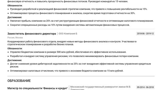 💼 Пример резюме финансового директора группы компаний поможет вам наглядно изучить готовые примеры составления эффективного документа. Используя этот опыт, вы сможете создать свое идеальное резюме и успешно пройти собеседование, приближаясь к получению желаемой должности. Эта страница поможет как начинающим, так и опытным специалистам финансовой сферы. Здесь вы найдете подробные пошаговые инструкции и готовые примеры для каждого раздела эффективного резюме финансового директора, включая: Мы разбираем,...