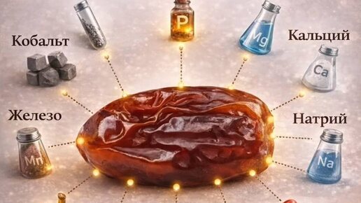 : · Витамины группы B: B1, B2, B3, B5, B6, B9 . · Витамин A . · Витамин C . · Витамин E . · Витамин K . ⚙️ Минералы Финики особенно богаты микро- и макроэлементами. Вот некоторые из них с процентным соотношением к средней суточной норме (данные могут немного отличаться в зависимости от сорта) : · Калий: 14–20% (очень важен для сердца) . · Магний: 13–14% (полезен для нервов и мышц) . · Медь: 40% (один из рекордсменов по содержанию) . · Марганец: 13–15% . · Кальций: около 6% (важен для костей) ...
