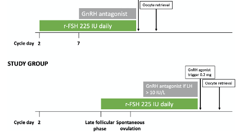 Ключевой вопрос исследования: Является ли стимуляция в поздней фолликулярной фазе такой же эффективной, как стимуляция в ранней фолликулярной фазе в протоколе с использованием антагонистов гонадотропин-рилизинг гормона (ГнРГ) у доноров ооцитов с точки зрения количества ооцитов. Как правило, стимуляцию яичников начинают в ранней фолликулярной фазе. Это основано на эндокринологической концепции фолликулогенеза, поддерживающей рекрутирование одной волны антральных фолликулов с отбором одного фолликула...