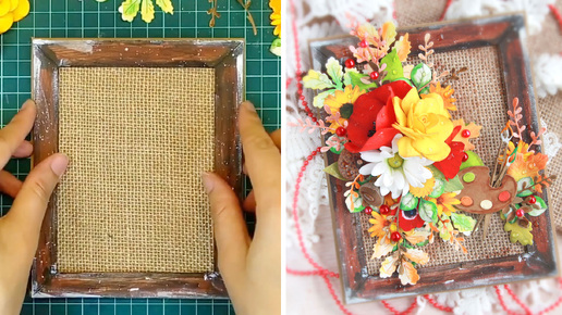 Выглядит как картина: осенняя открытка с букетом цветов из фоамирана, ажурных веточек и листьев. Показываю процесс и результат