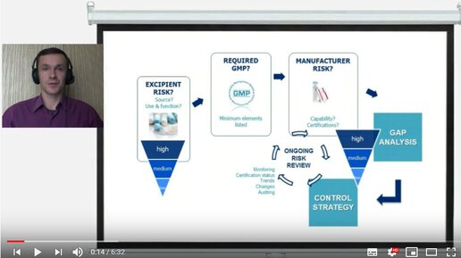 В этом видеосюжете кратко рассмотрим формализованную оценку рисков касательно вспомогательных веществ, используемых в составе в лекарственных препаратах для человека. Какие требования GMP необходимы для производства вспомогательных веществ? Это и должна определить формализованная оценка рисков...