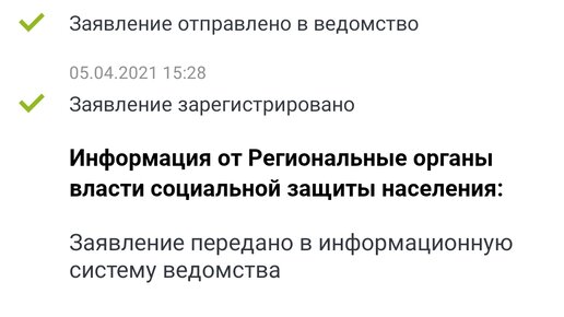 Доброе время суток, дорогие читатели моего блога! Свершилось! Мне наконец-то ответили на мое заявление о назначении пособия от 3-х до 7 лет. Ответ - положительный. Как я уже писала в своих прошлых статьях , подавала заявление 5 апреля, с 10 апреля оно было принято к рассмотрению и с тех пор статус так и не менялся, вплоть до 26 мая. Пособие на ребенка от 3 до 7 лет. Сменился статус заявления. Часть 2. Правда, есть одно НО! Пока я не знаю, какую сумму мне назначили и на сколько процентов одобрили, так как не прикрепили никакой файл с расчетами...