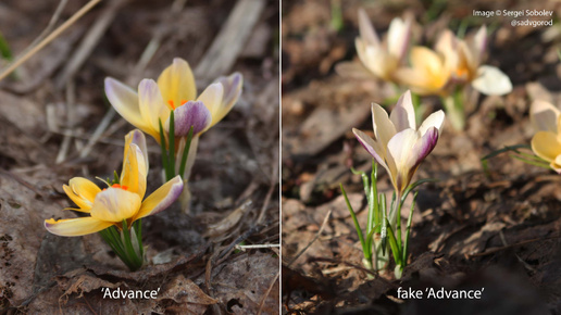 У этой истории есть длинная предыстория. Дело в том, что если выбирать крокусы по обложкам в супермаркете или на сайтах крупных поставщиков, можно наткнуться на на чудесный двуцветный сорт Шафрана золотистого 'Advance' ([эдв'анс]). Перевод названия — продвижение, достижение. И, действительно, сорт обещает чудесную комбинацию мягких жёлтых (на внутренней стороне лепестков) и сиренево-голубых (на внешне стороне внешних лепестков) оттенков. А дальше начинается вакханалия фотошопа. Трудно представить,...