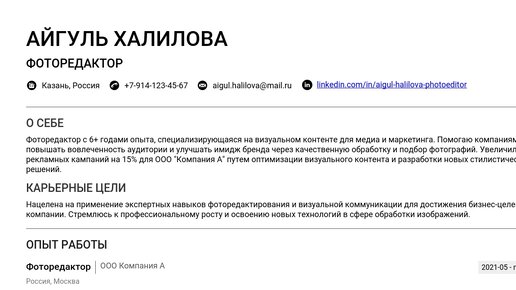 Пример резюме фоторедактора — ваш надежный ориентир для создания документа, который выделит вас среди других кандидатов. Изучение готовых примеров поможет вам составить действительно эффективное резюме и быстрее получить желаемую работу. Здесь собраны готовые примеры резюме фоторедактора для начинающих и опытных специалистов, а также подробные пошаговые инструкции по составлению каждого раздела. Мы разберем, как правильно описать опыт и актуальные навыки в соответствии с требованиями работодателей, а также дадим советы по адаптации вашего резюме под конкретные вакансии...