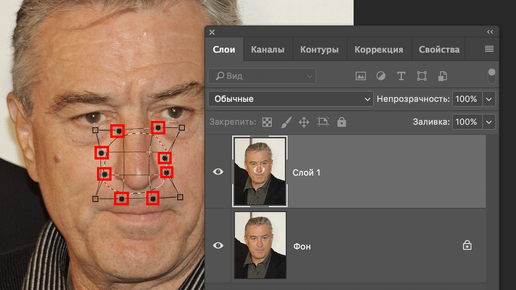 Это наш авторский материал с нашего официального сайта (MyPhotoshop.ru), которым мы, как всегда, рады с вами поделиться. Поддержите проект лайком, репостом и комментом. Поехали! Мы возьмем для примера фотографию потрясающего актера – Роберта Де Ниро. Нам предстоит уменьшить его нос. Что ж, давайте приступим. Первым делом нам потребуется создать копию исходного слоя. Для этого выделяем слой и зажимаем на клавиатуре CTRL+J. Теперь выделяем область, которую требуется изменить любым удобным способом...