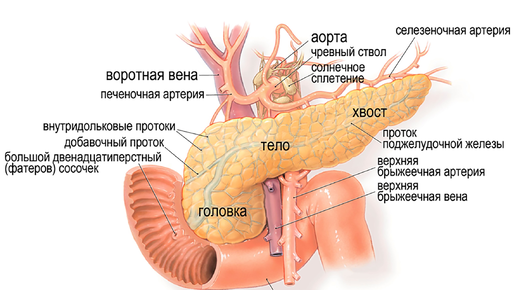 Поджелудочная железа (pancreas) является смешанной пищеварительной железой. У взрослого человека длина ее составляет 14—18 см, ширина 3—9 см, толщина 2—3 см, масса 70—80 г. В поджелудочной железе выделяется: Головка прилегает к петле двенадцатиперстной кишки. Задняя поверхность головки лежит на нижней полой вене и аорте, спереди ее пересекает поперечная ободочная кишка. Тело поджелудочной железы имеет форму треугольника и три поверхности — переднюю, заднюю и нижнюю, а также три края — верхний, передний и нижний...