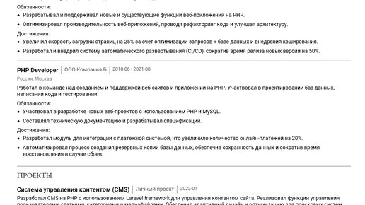 Пример резюме fullstack PHP developer'а 2025 - Как составить