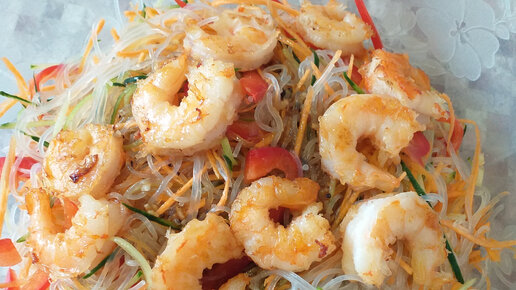 Простой и быстрый рецепт салата «Фунчоза с нежными креветками и свежими овощами»