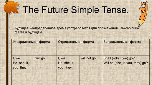 Future simple Future Simple Tense (или просто Future Simple) — это простое будущее время в английском языке. Мы используем Future Simple, чтобы высказать предположения о будущем или о событиях, которые точно произойдут и на которые мы не можем повлиять. А также, для обещаний, угроз, предупреждений и предостережений. I / She / He / It / We / You / They + will + V I will read an interesting book — Я буду читать интересную книгу You will buy a new dress — Ты купишь новое платье He will play tennis...
