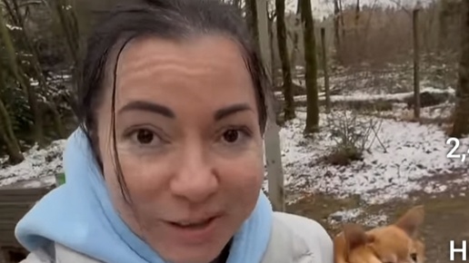 Женщина прогуливается по двору с собачкой и рассказывает о ситуации с жильём в Германии. Показывает соседний дом.