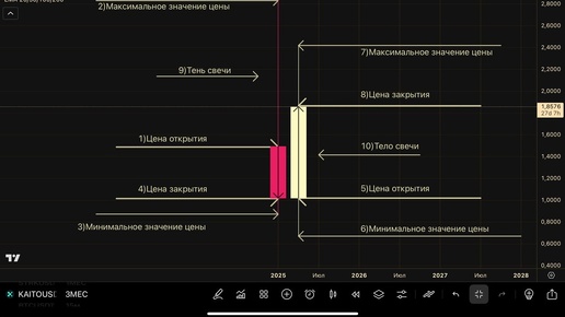 Давай разберем на примере На графике выше видим монету kaitousdt, таймфрейм 3 месяца, это означает что каждая из этих двух свечей содержит в себе информацию цены за 3 месяца. Торги этой монеты были открыты в точке (1), где сразу начали преобладать покупатели, в итоге цена дошла до своего максимального значения (2), откуда продавцы опустили цену до минимального значения (3) и когда люди начали откупать актив свеча закрылась, образовав (9) тело свечи и (10) тени. Далее по графику мы видим что следующая свеча началась с продаж(5—6), но затем цену сильно откупили (7)...